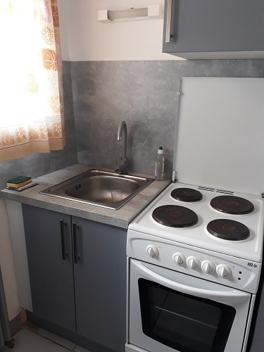 Cuisine équipée (cuisinière, congélateur, micro-onde, vaisselle etc), chambre (lit double), salle de douche.