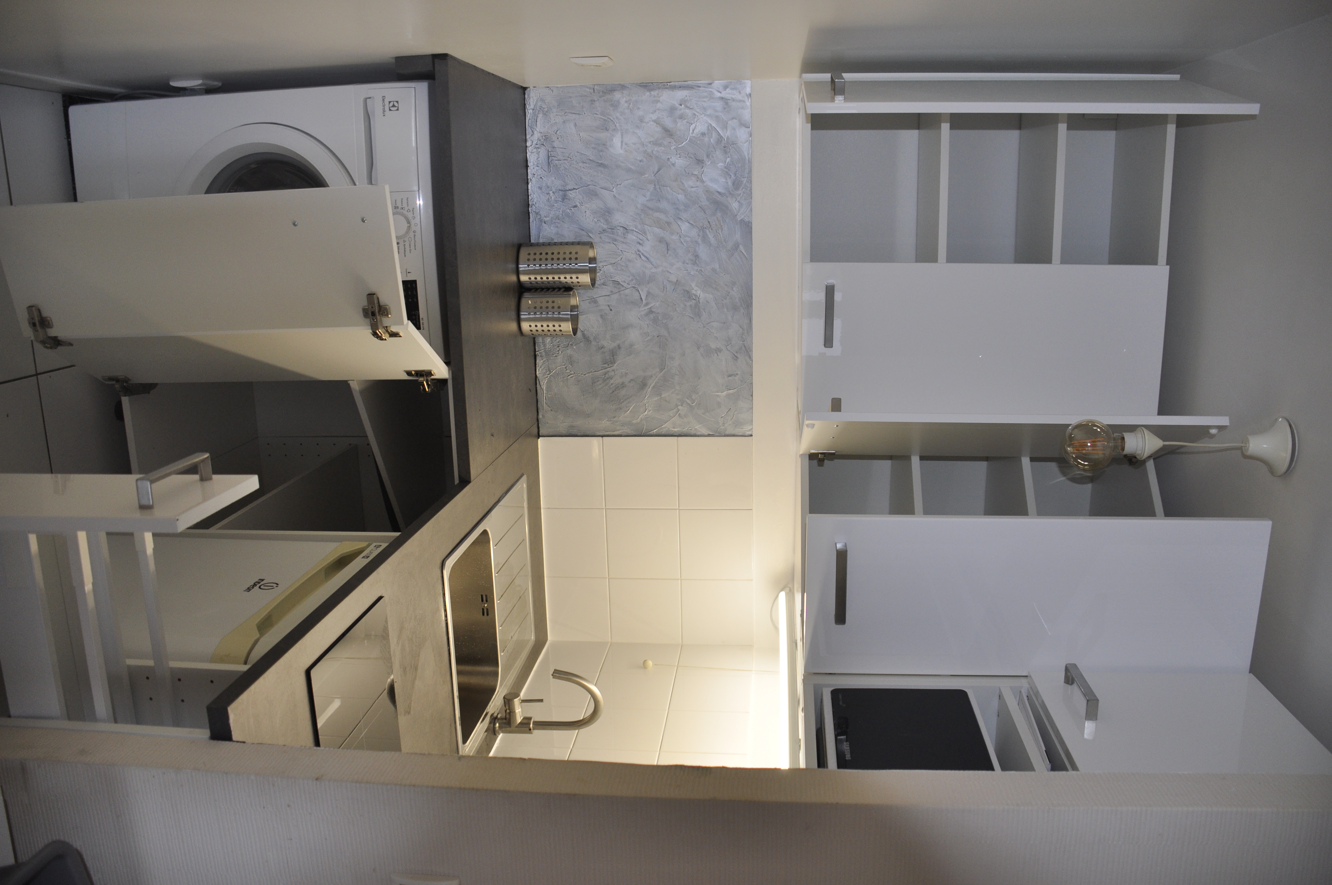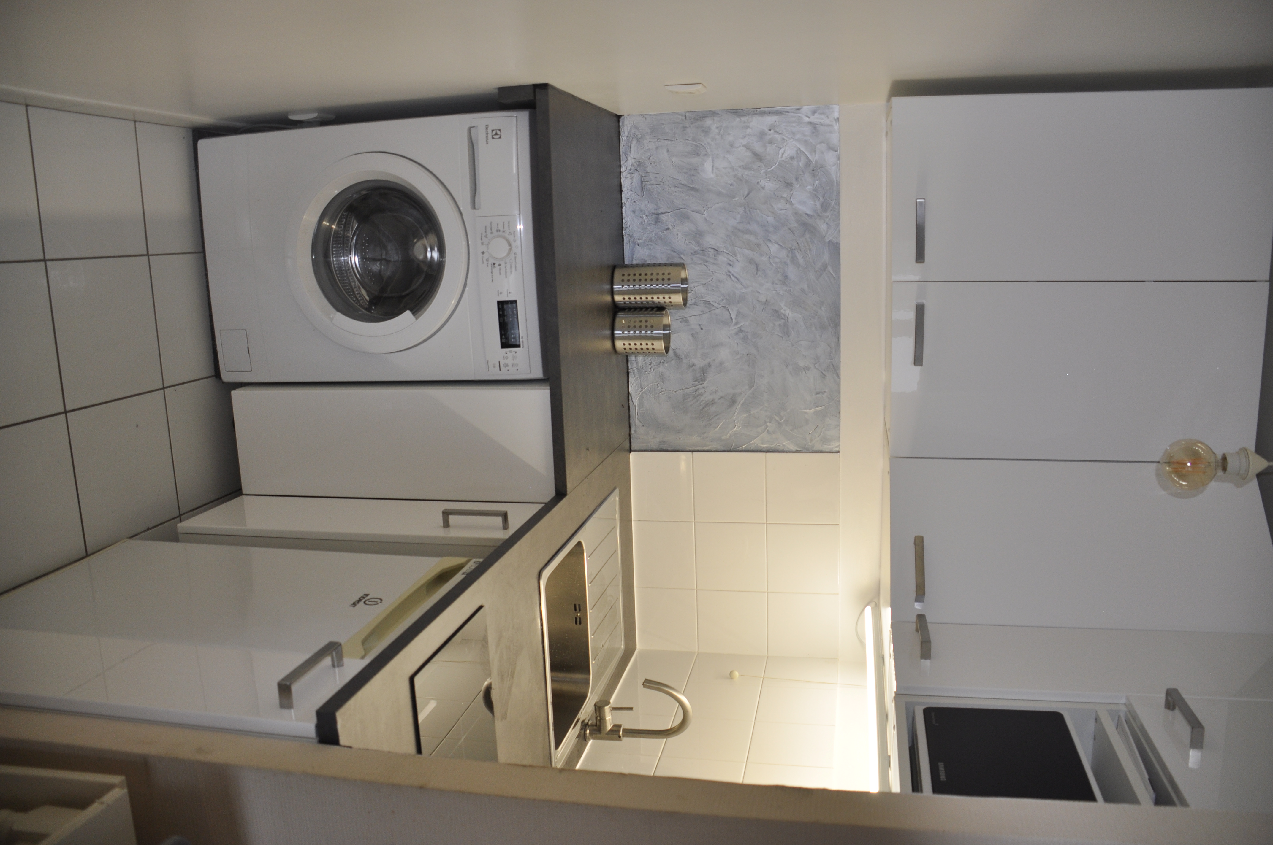 Cuisine équipée, plaques de cuisson, lave linge, micro onde, placards.