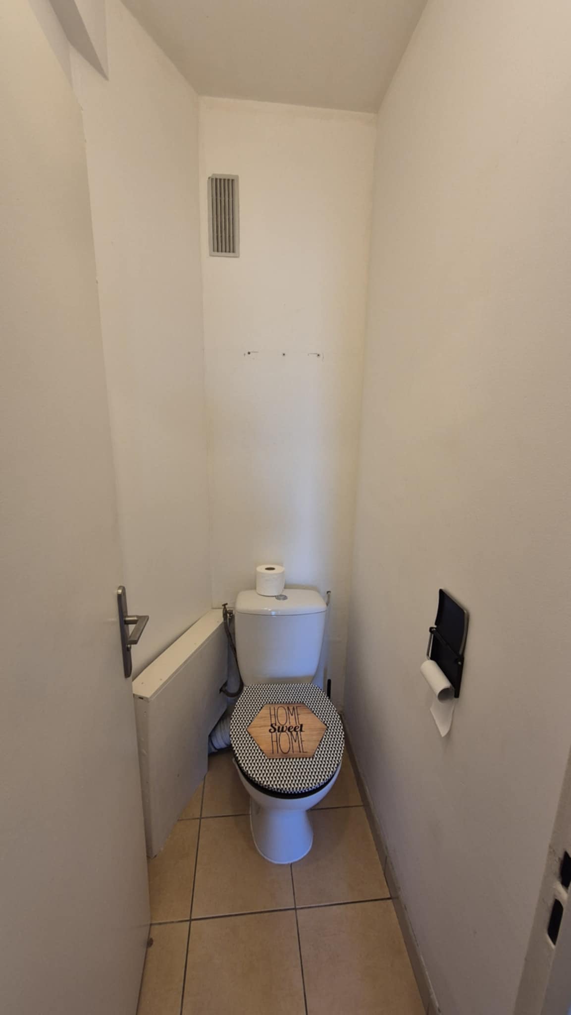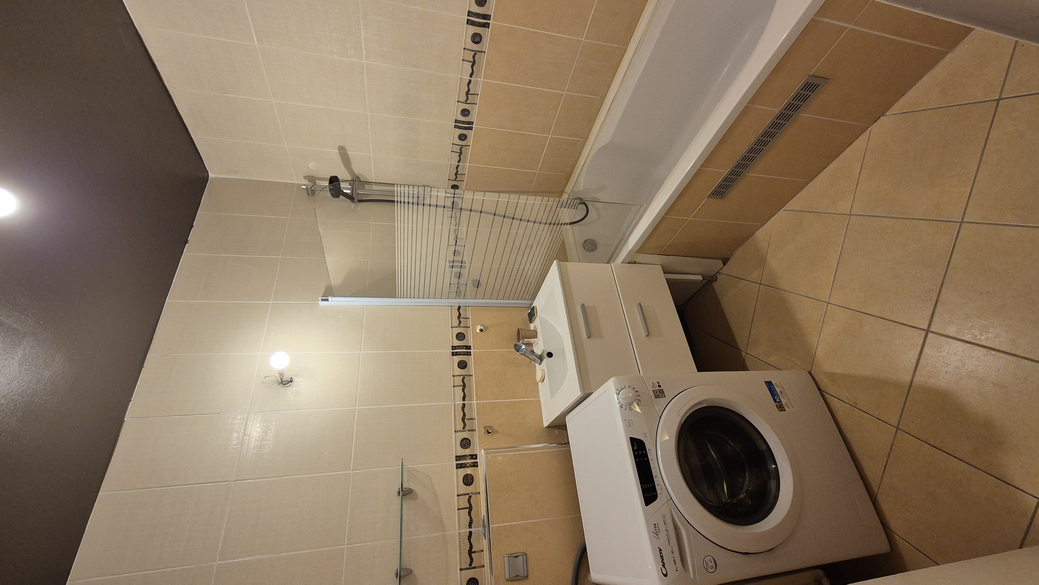 ⛲ Salle de bain avec douche, sèche serviette, rangement et machine à laver. WC séparé. Equipement de nettoyage fourni (Aspirateur, étendoir, balai etc..)