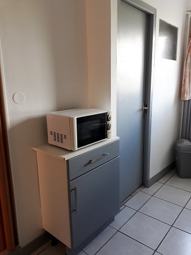 Cuisine équipée (cuisinière, congélateur, micro-onde, vaisselle etc), chambre (lit double), salle de douche.