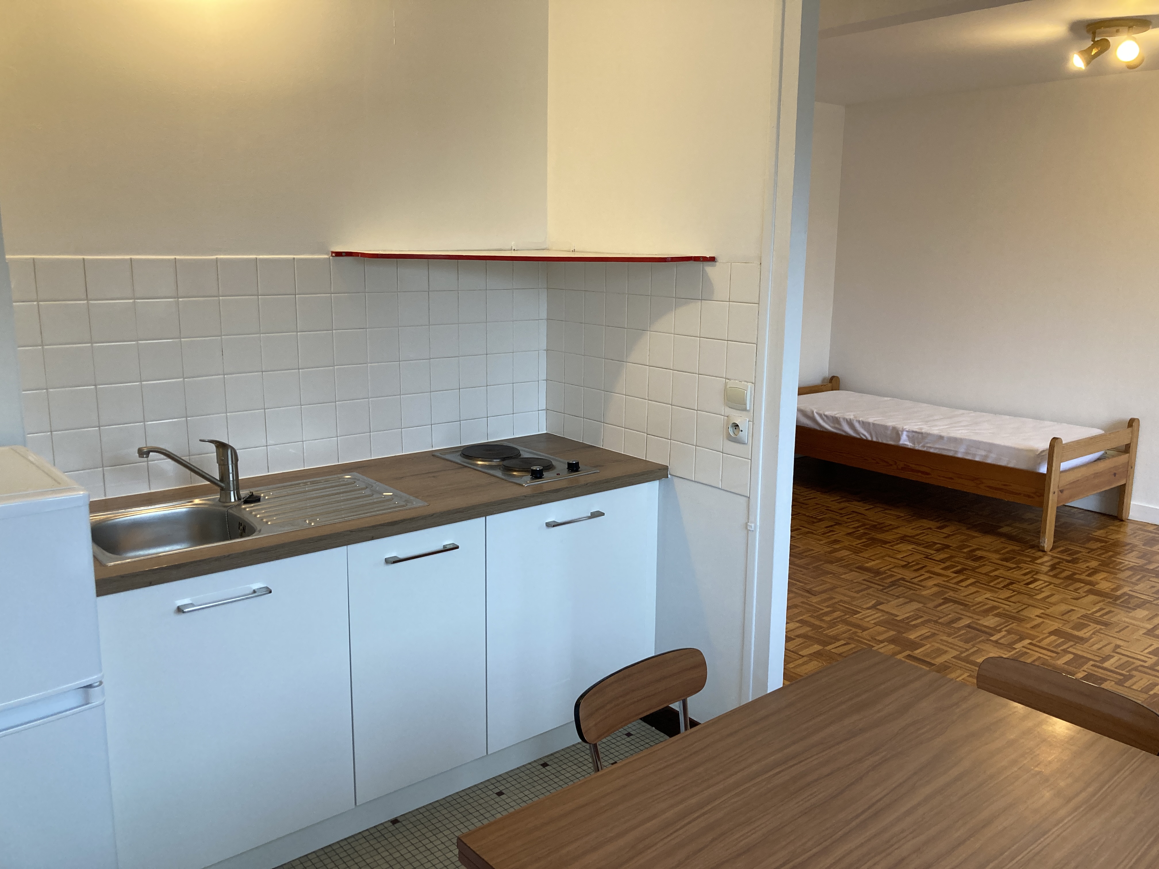 - cuisine équipée neuve : frigo-congélateur/ 2 plaques chauffantes, vaisselle et ustensiles de cuisine