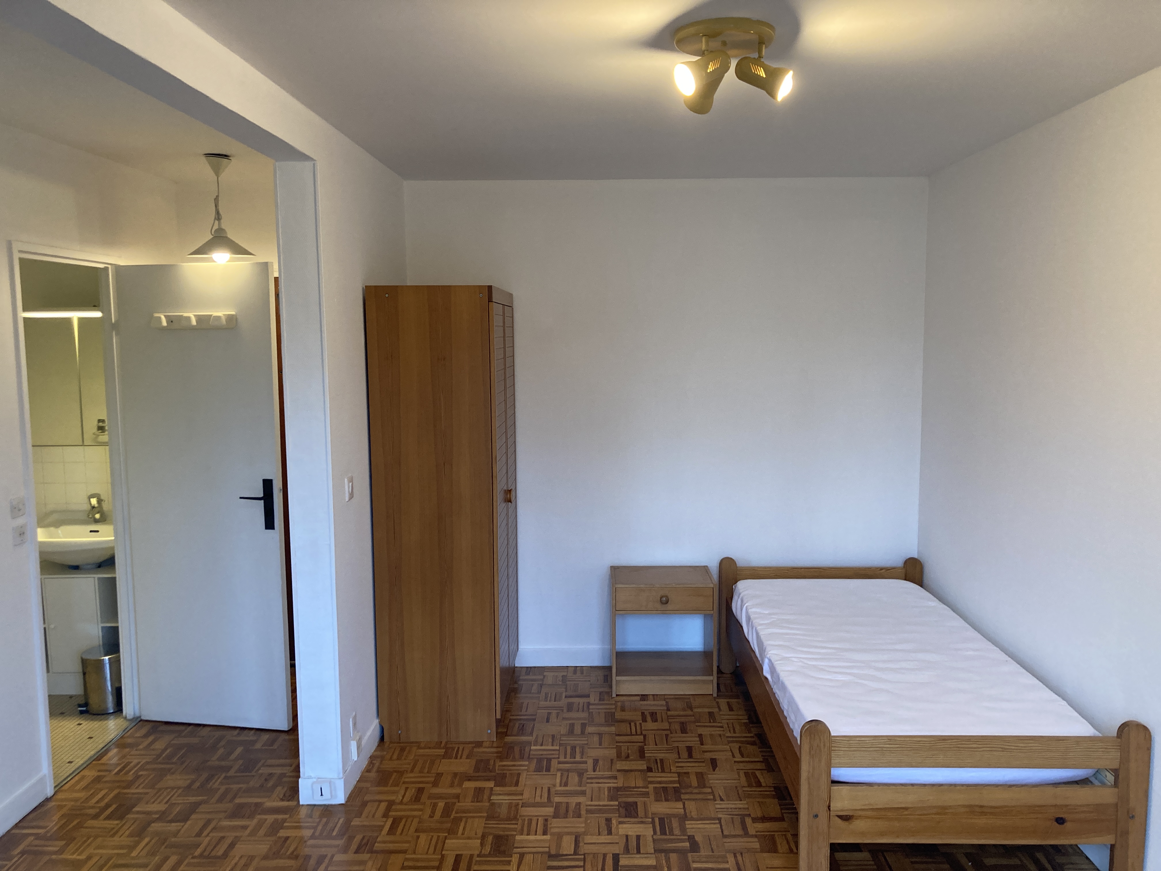 - lit simple, matelas, armoire, table avec 3 chaises, bureau, bibliothèque, table de nuit