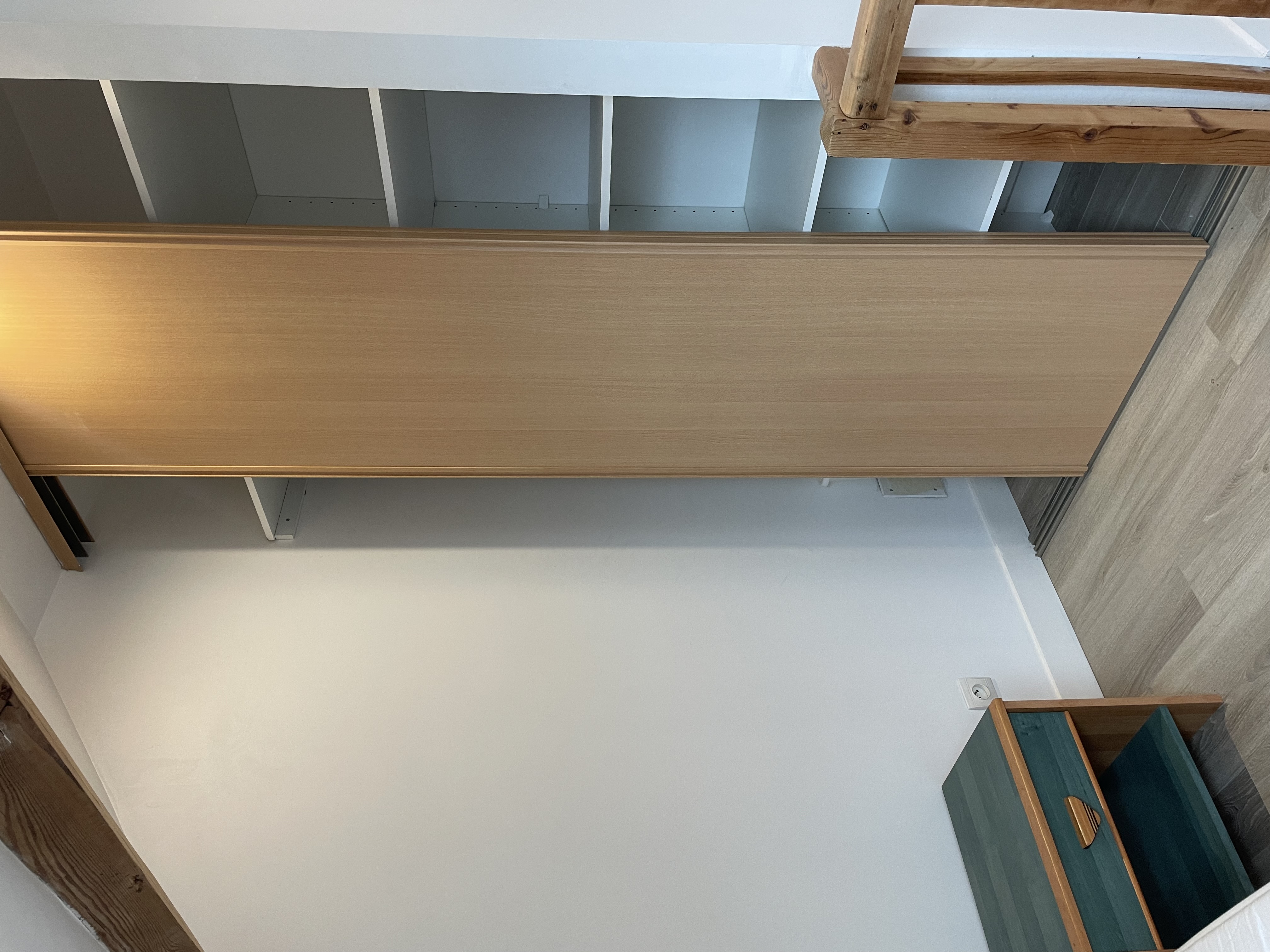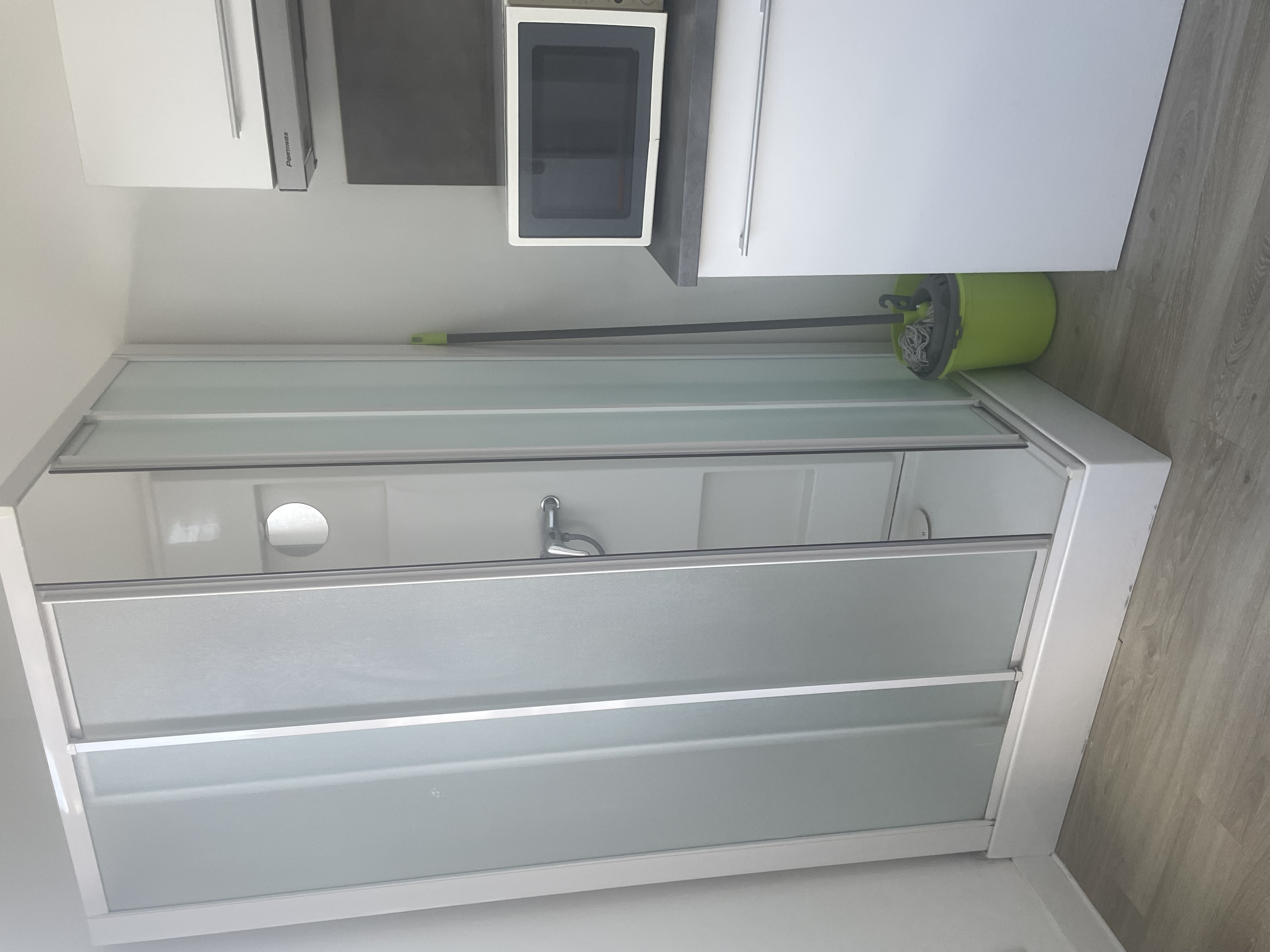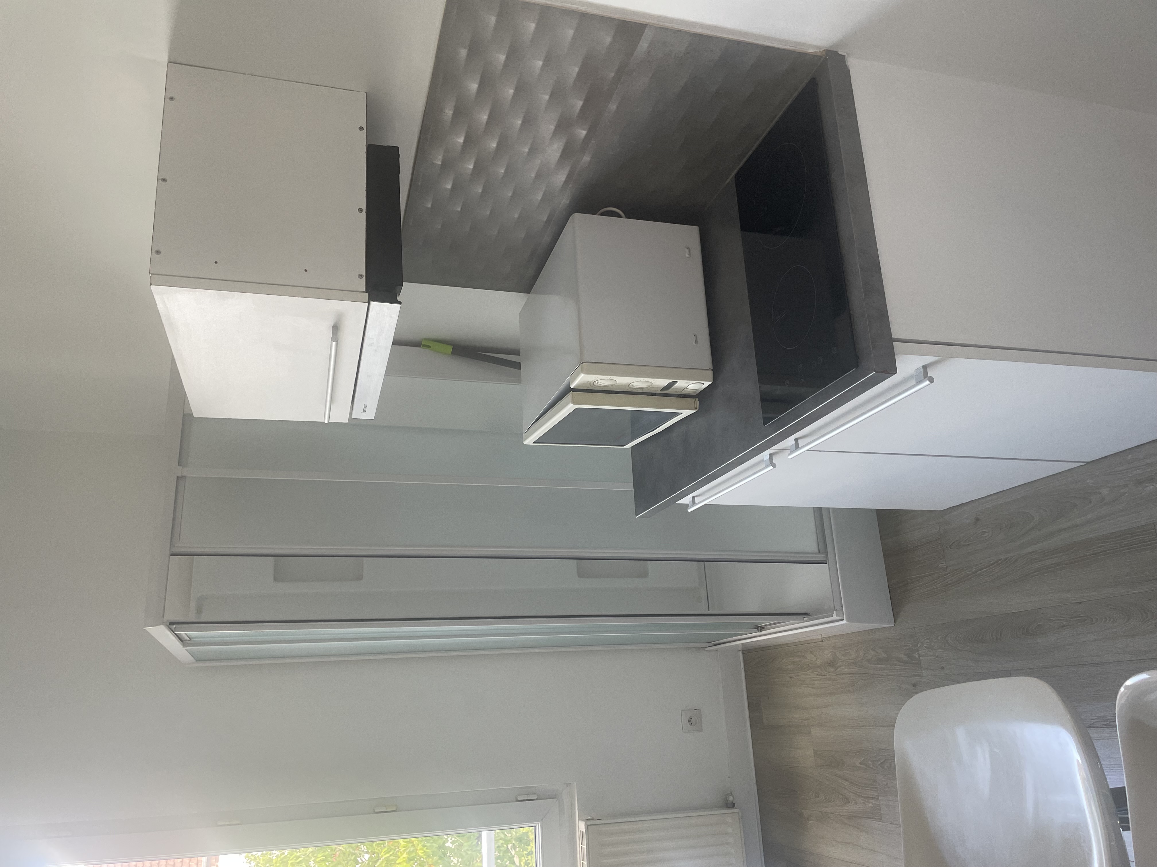 Cuisine équipé réfrigérateur, plaque induction, micro-ondes hotte.