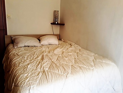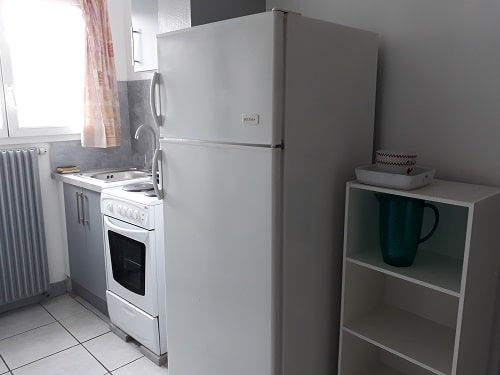 Cuisine équipée (cuisinière, congélateur, micro-onde, vaisselle etc), chambre (lit double), salle de douche.