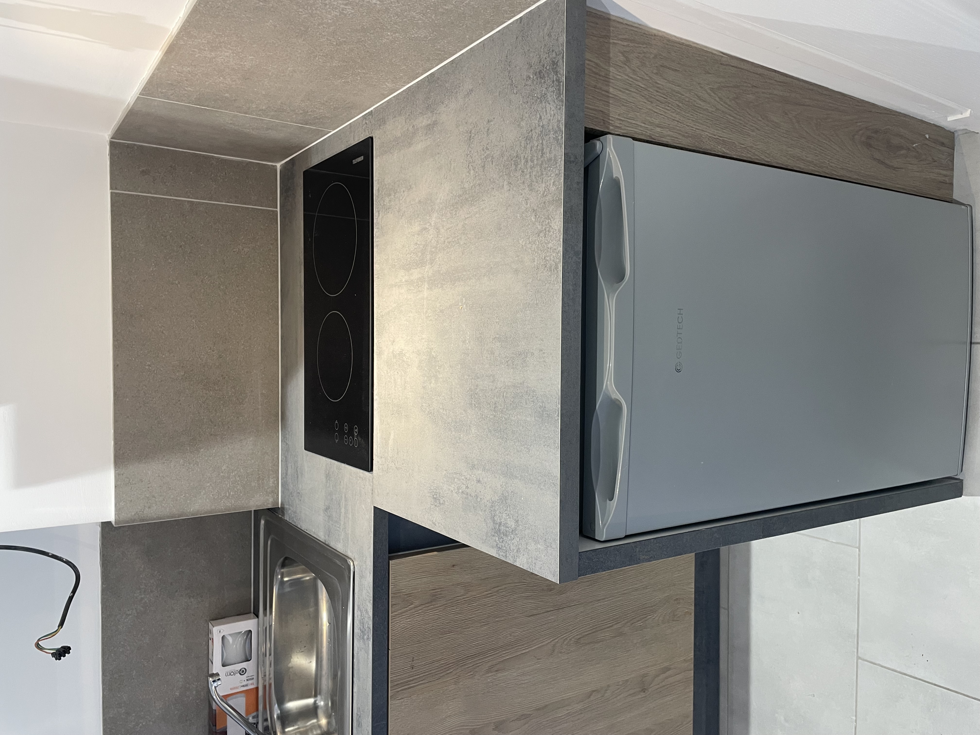 Une cuisine équipée avec micro-ondes, réfrigérateur, plaques induction hôte aspirante et évier.Table bar + tabouret.