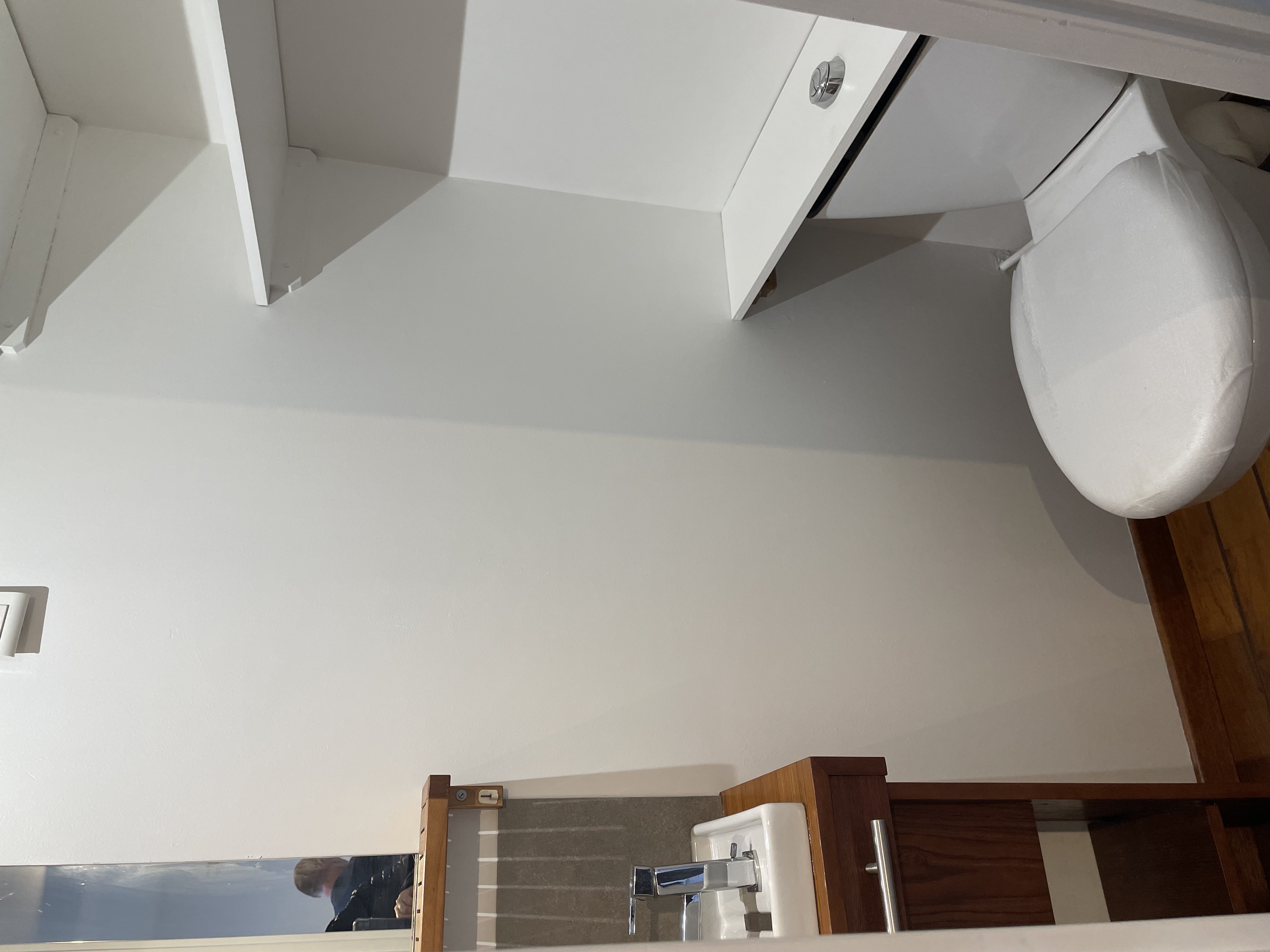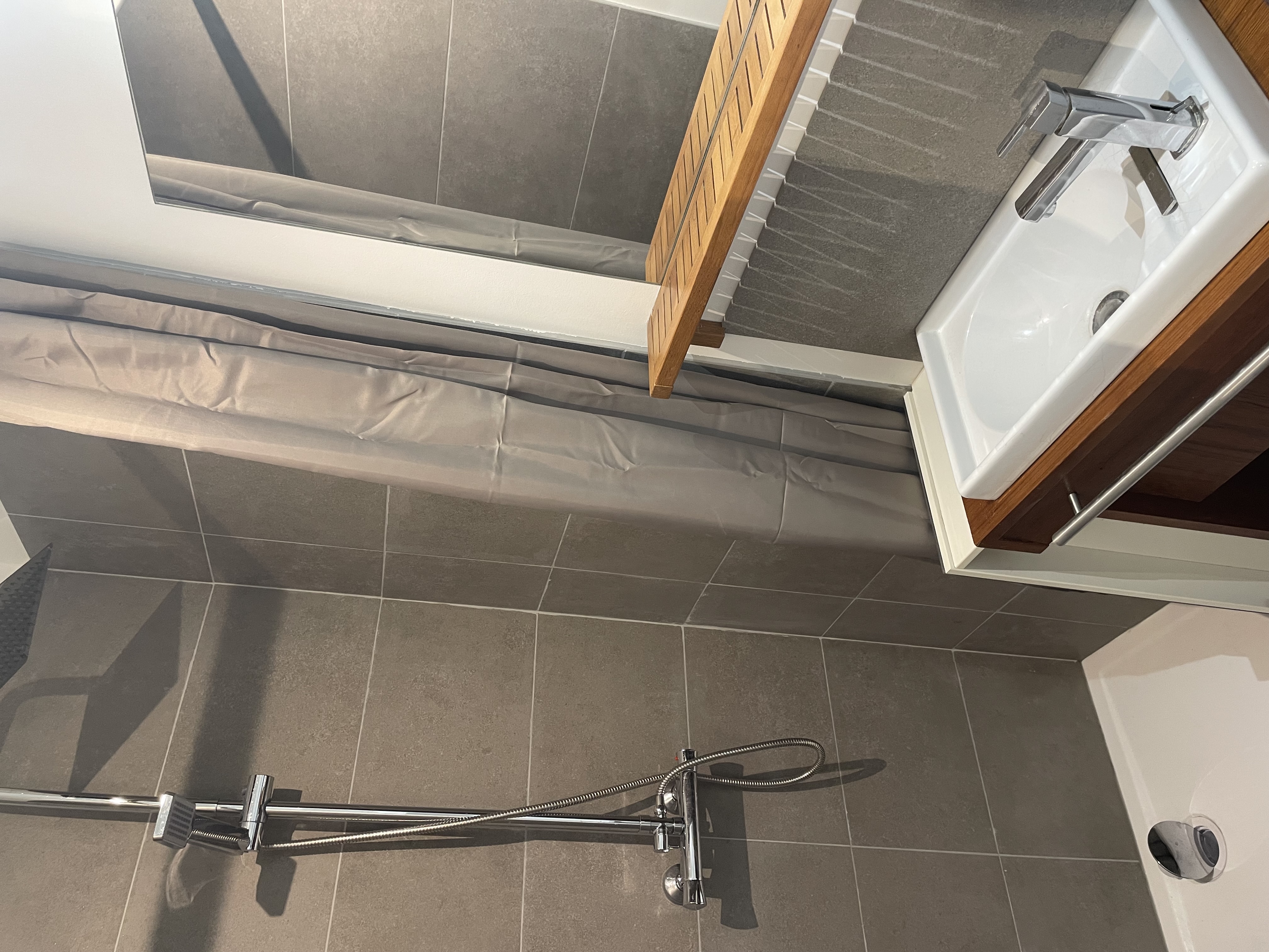 Produit de luxe Salle de bain avec grande douche à l'italienne , lavabo miroir et WC, parqueté en teck.