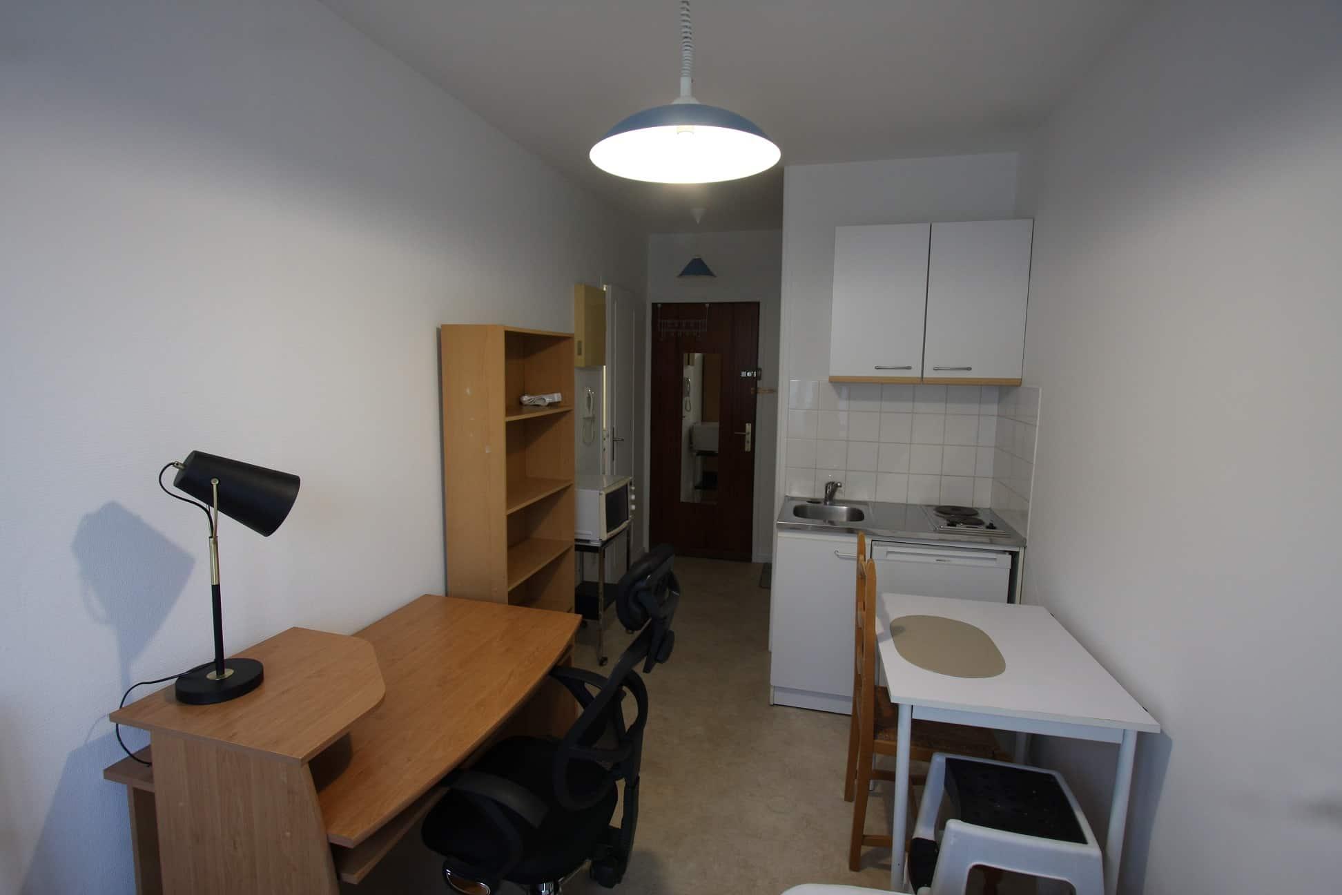 Tout proche de l'UTC, appartement comprenant une pièce meublée avec coin cuisine équipée, salle de douches. Local à vélo. Les charges comprennent l'eau et les charges communes. Electricité à la charge du locataire.
