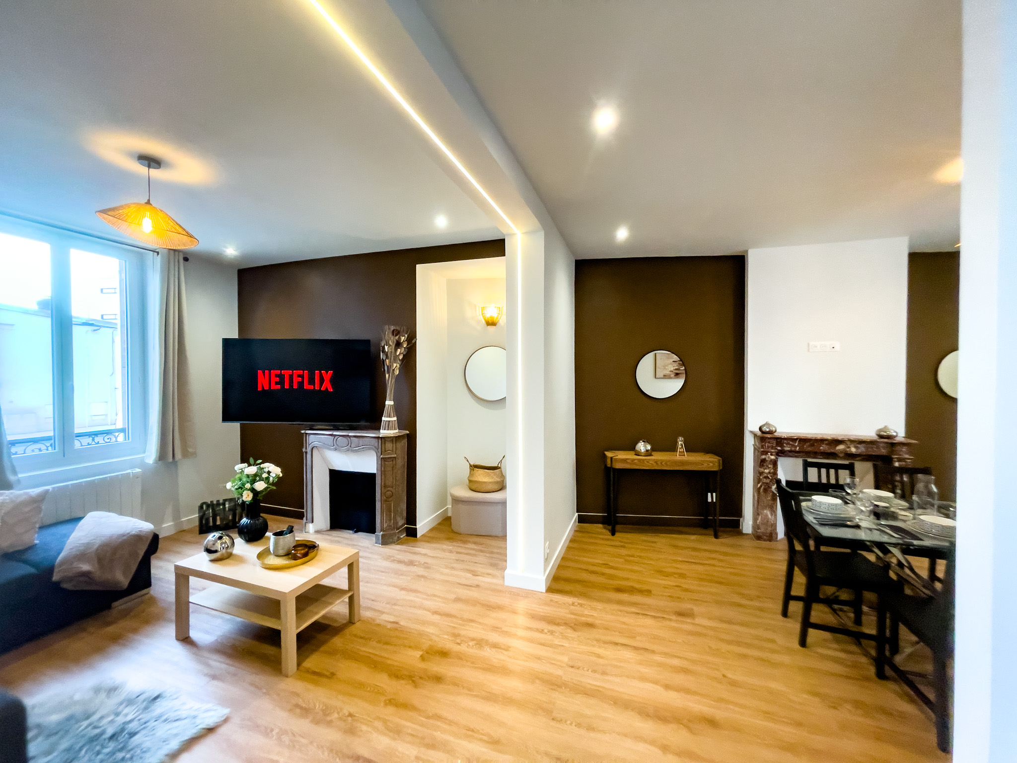 * Equipements neufs (four, plaque induction, lave-vaisselle, 2 réfrigérateurs combinés, 2 micro-ondes, lave-linge, sèche-linge, smart TV 65 pouces avec abonnement Netflix, machine à café, grille-pain, bouilloire, ...)