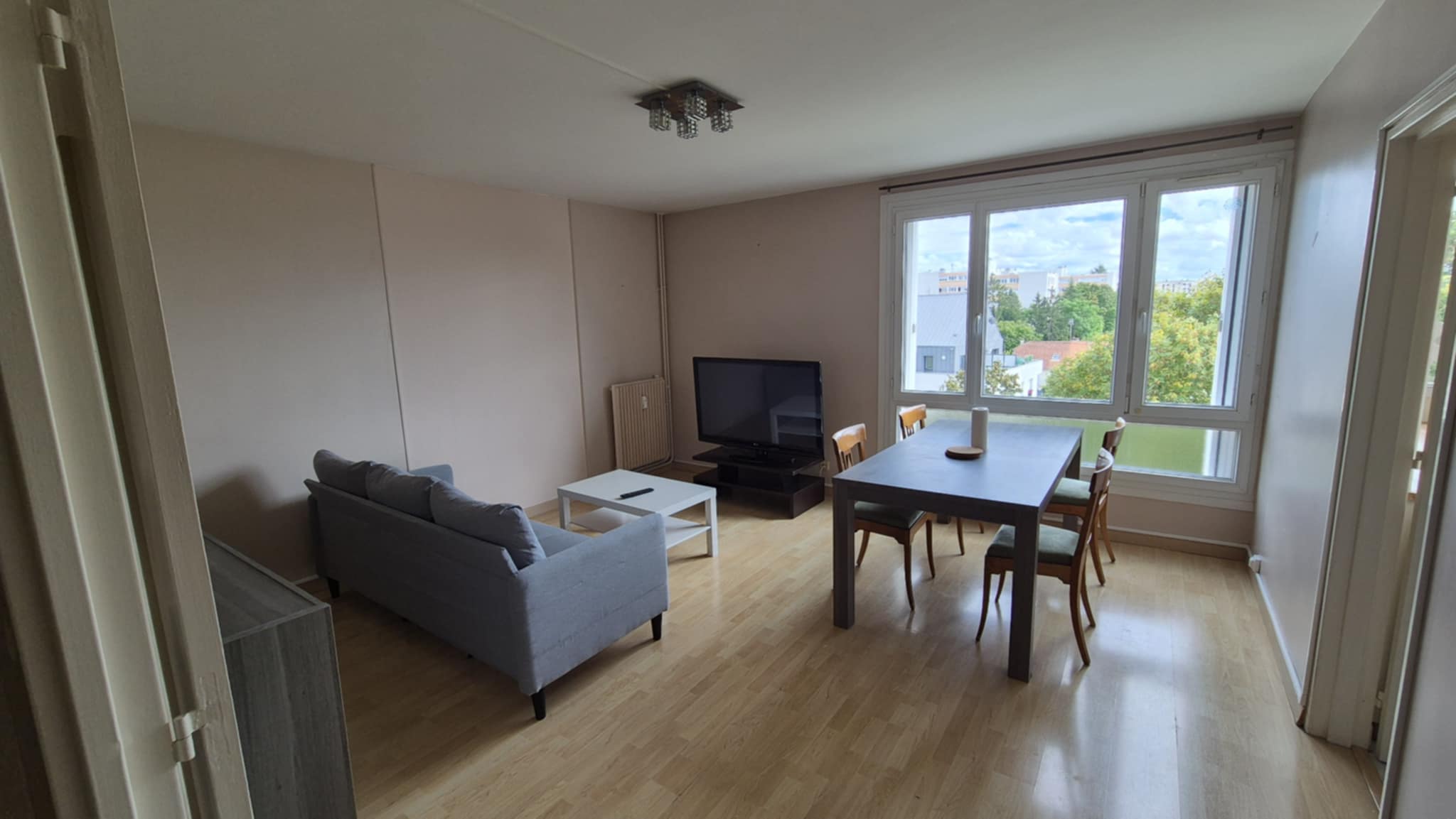 🛋 Séjour lumineux avec canapé, table basse, table à manger, chaises, TV de 120cm, buffet
