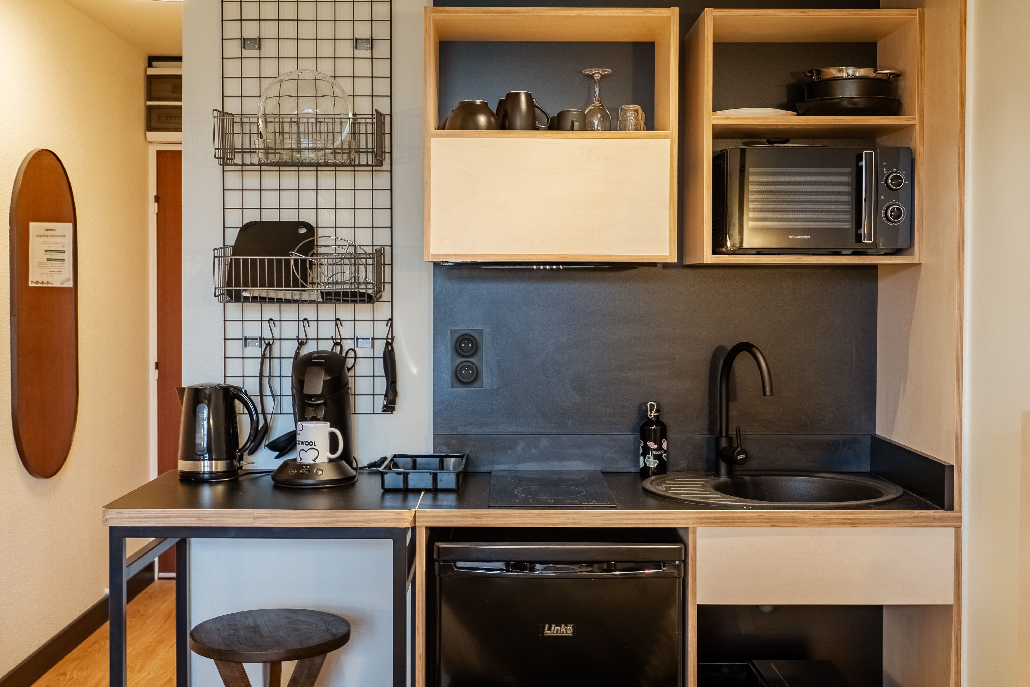 🍴 Cuisine équipée : frigo, plaques de cuisson, micro-ondes, cafetière Senseo, bouilloire, ustensiles de cuisine, vaisselle...
