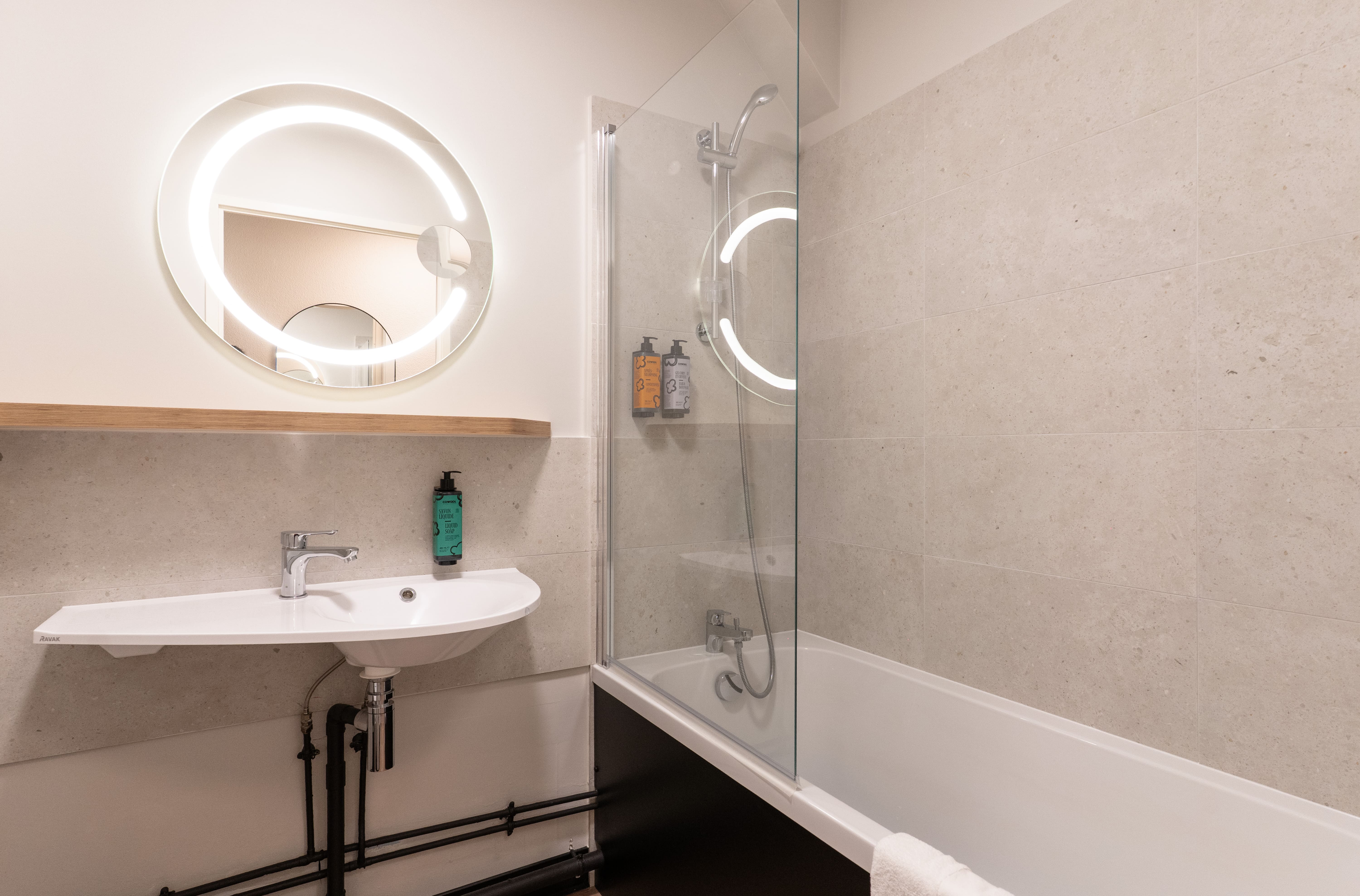 🚿 Salle de bain avec baignoire (option d’avoir une douche) et sèche serviettes